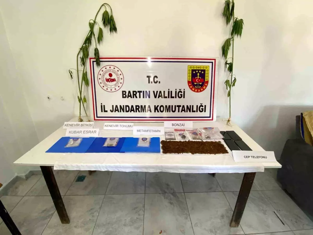 Bartın, Zonguldak, İstanbul vilayetlerinde, Bartın Jandarma Komutanlığı grupları tarafından şafak vakti eş vakitli operasyon yapıldı. Operasyonlarda 4 kişi gözaltına alınırken, şahısların üzerinde ve ikametlerinde gerçekleştirilen aramalarda ise 42 gram bonzai, 1 gram metamfetamin, 1 gram kubar esrar, 4 gram kenevir tohumu, 3 kök kenevir bitkisi, 3 adet kuru sıkı tabanca, 117 adet 9 mm tabanca fişeği, 22 adet 7,65 mm tabanca fişeği, 1 adet bandrolsüz viski, 2 adet bandrolsüz votka, 1 adet kılıç, 1 adet elektronik sigara, 4 adet cep telefonu, hatadan elde edildiği bedellendirilen 54 bin 500 TL nakit para ele geçirildi.